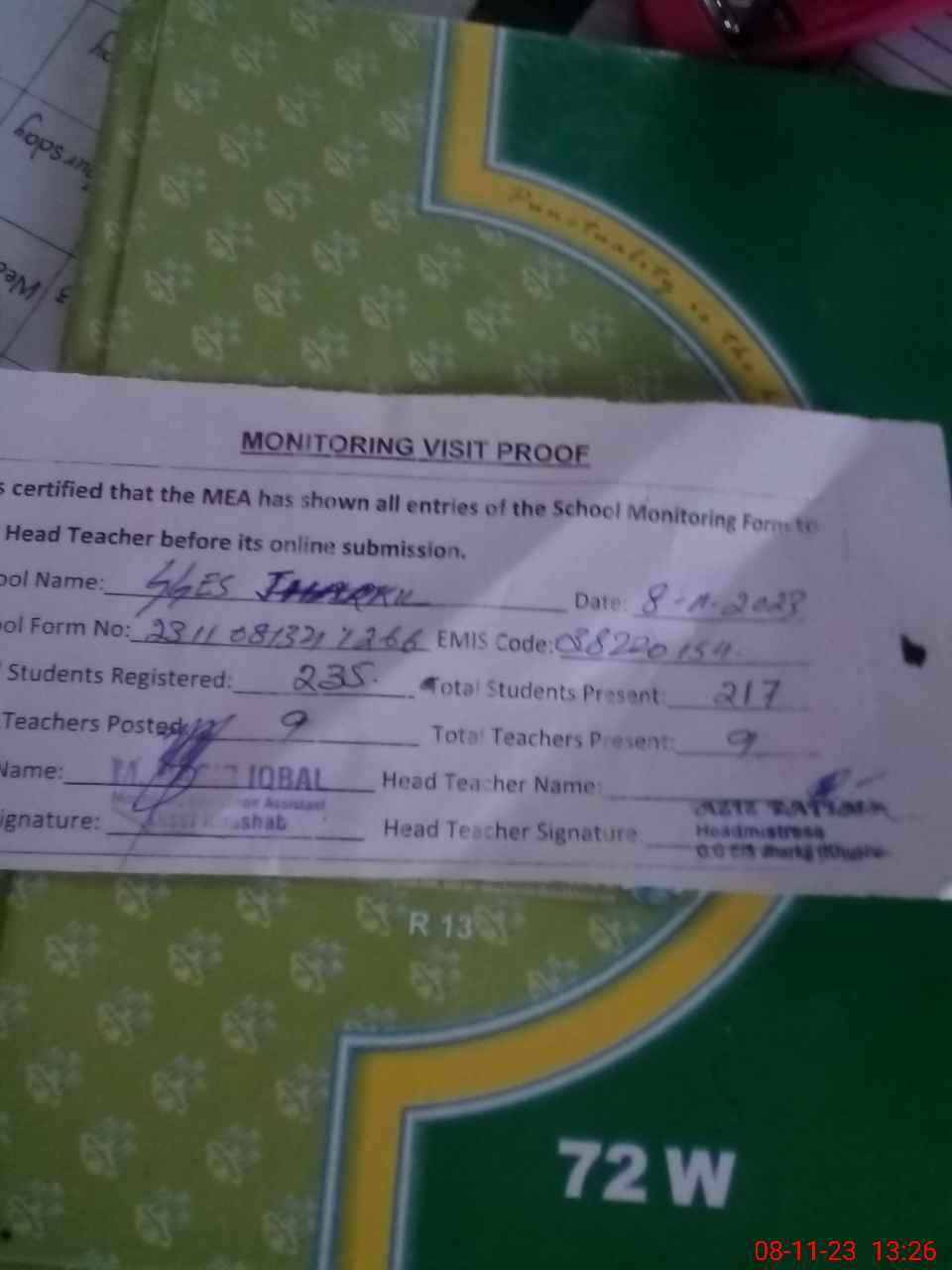 | Attendance Register | Head Teacher | MEA with School | Visit Proof |