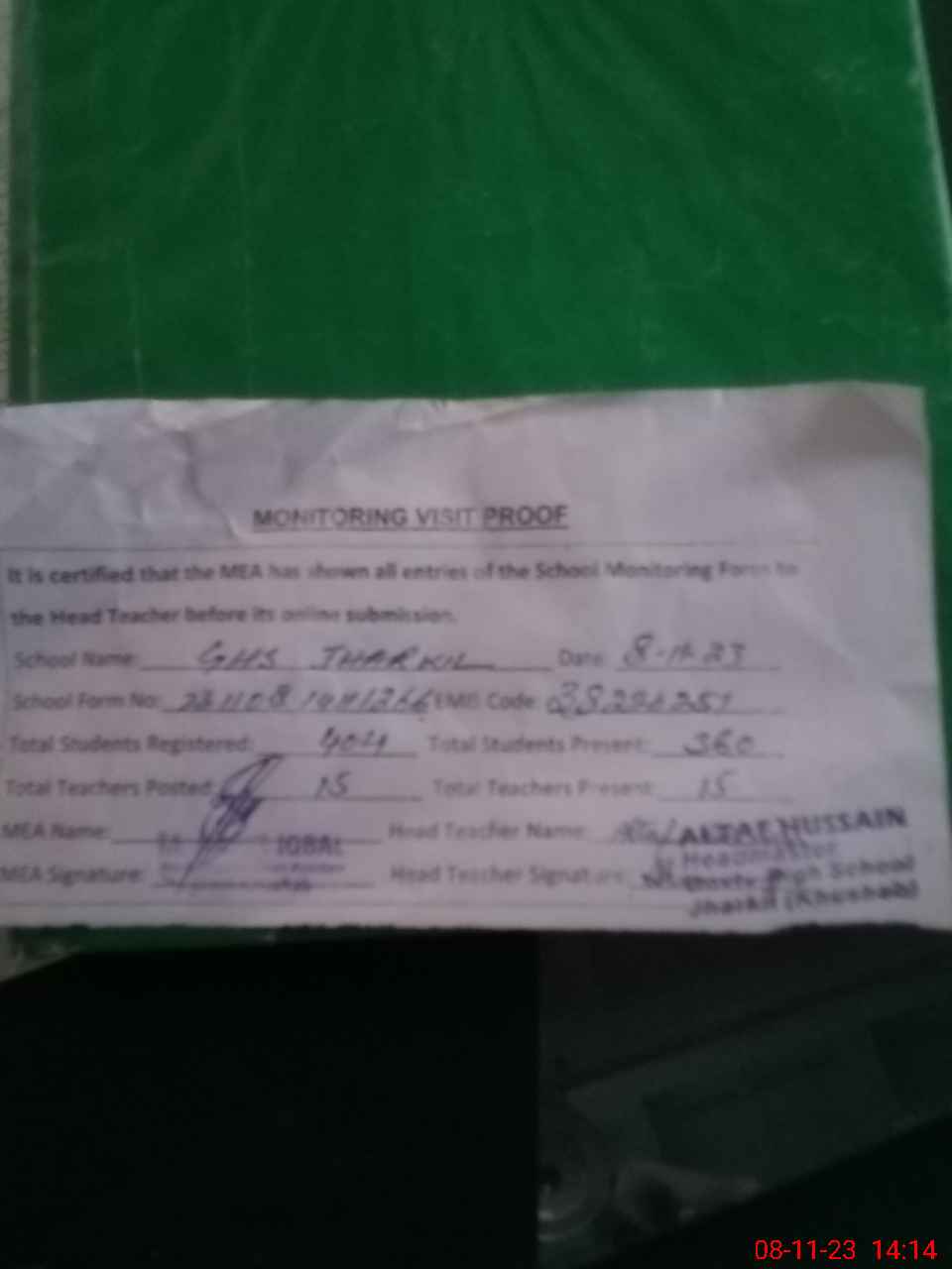 | Attendance Register | Head Teacher | MEA with School | Visit Proof |