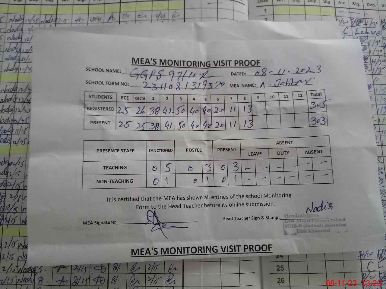 | Attendance Register | Head Teacher | MEA with School | Visit Proof |