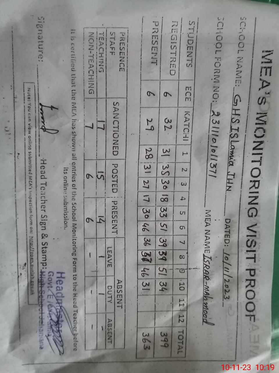 | Attendance Register | Head Teacher | MEA with School | Visit Proof |