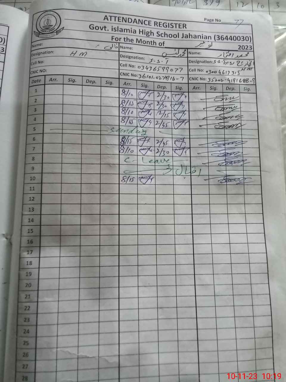 | CNIC | Full Name | Designation | R/C | Absence During Last Calender Month |