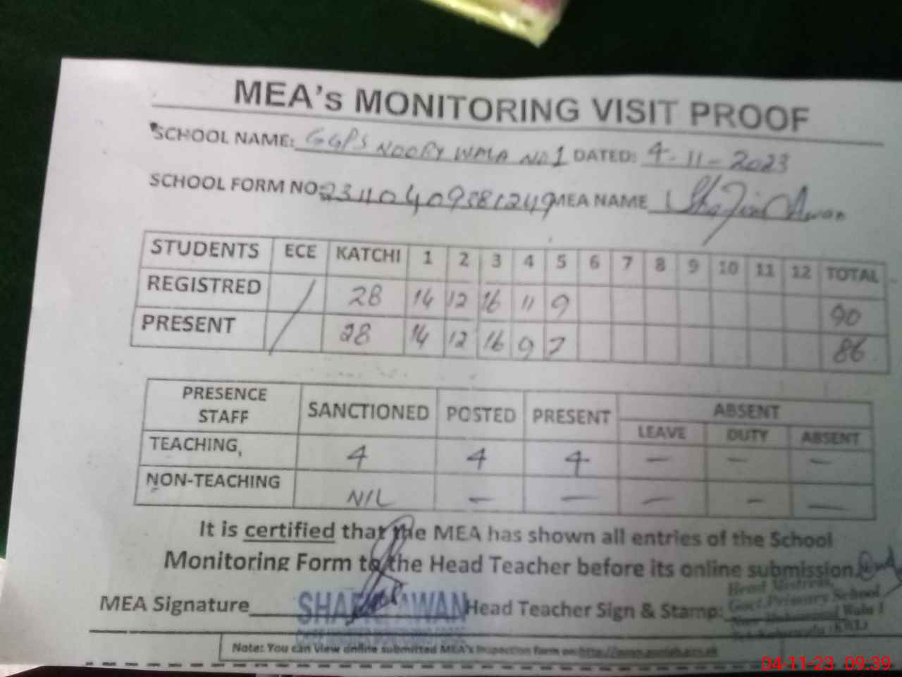 | Attendance Register | Head Teacher | MEA with School | Visit Proof |