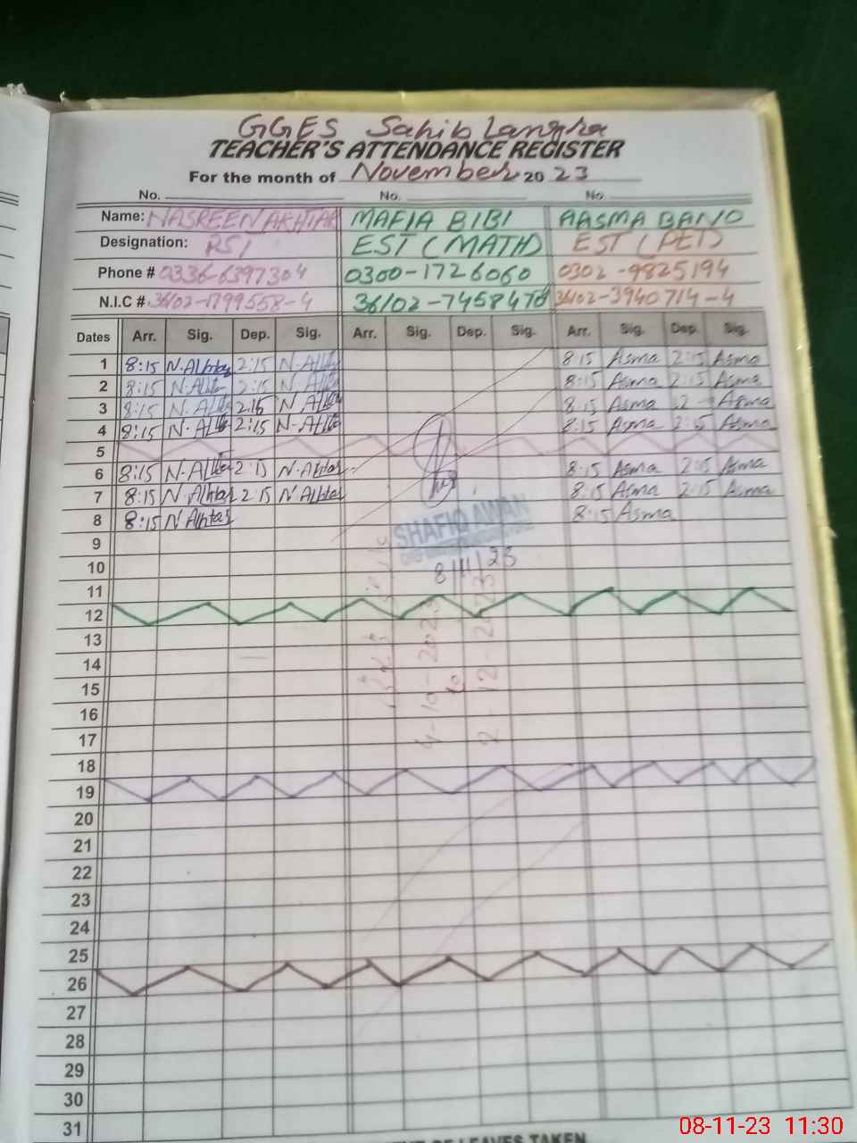 | CNIC | Full Name | Designation | R/C | Absence during last cal. month |