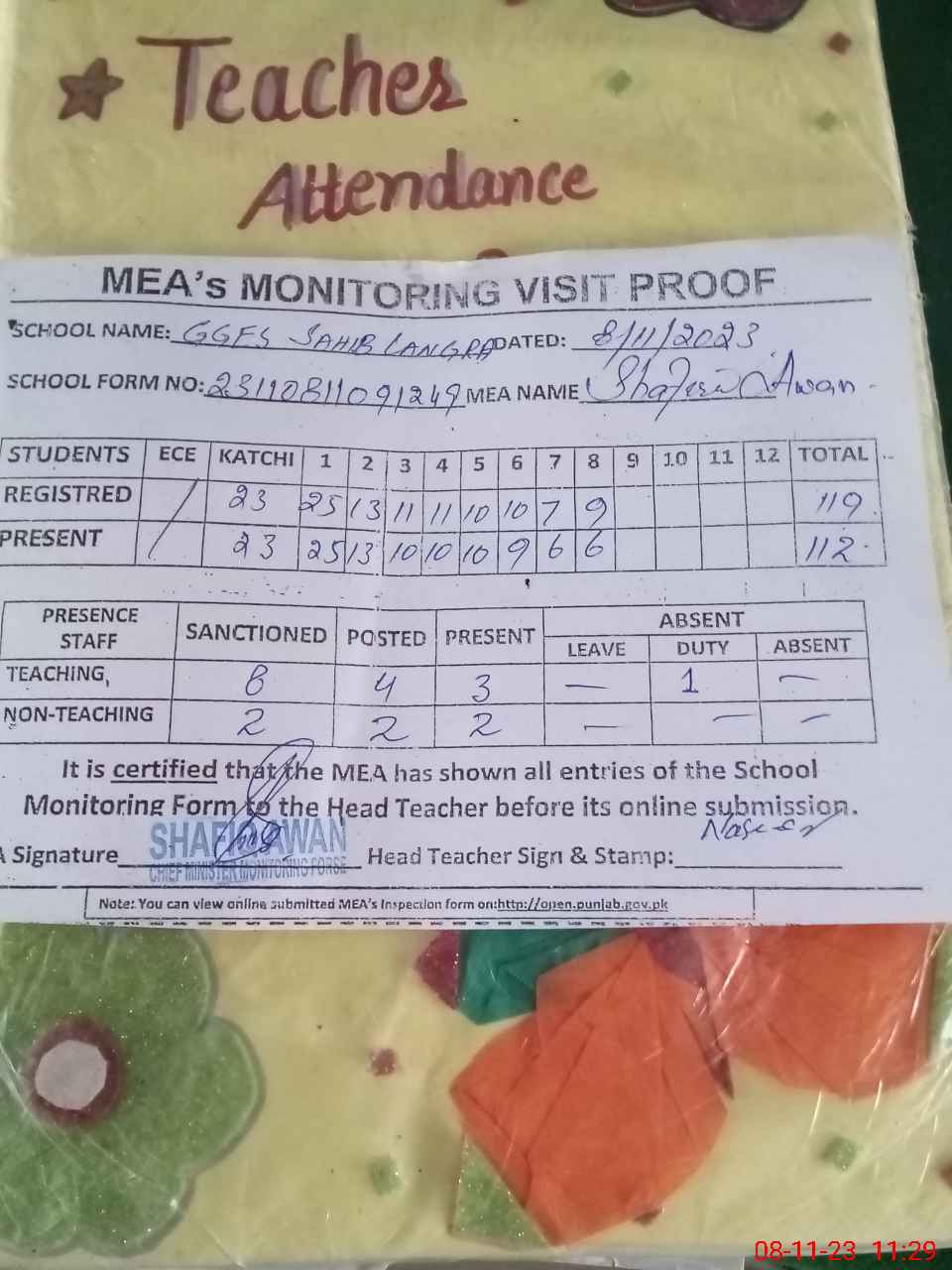 | Attendance Register | Head Teacher | MEA with School | Visit Proof |
