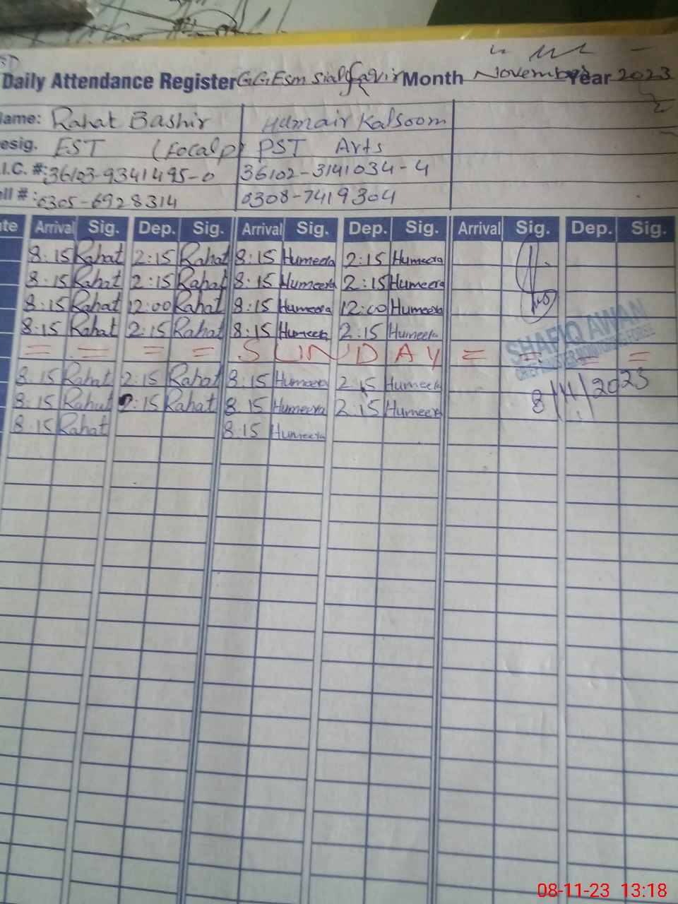 | CNIC | Full Name | Designation | R/C | Absence During Last Calender Month |