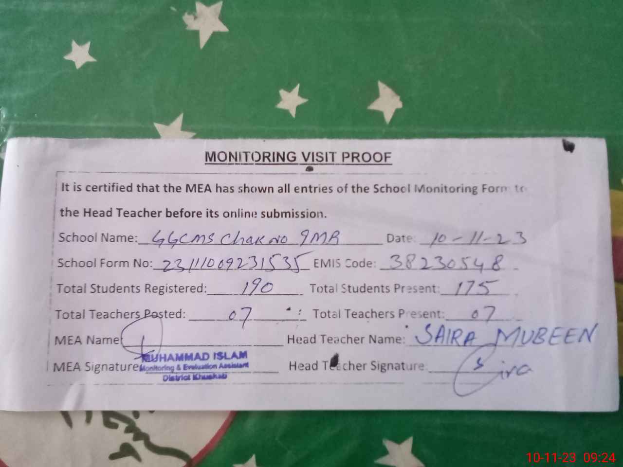 | EMIS Code: 38230548 | Name of School: GGCMS CHAK NO. 9 MB | |||