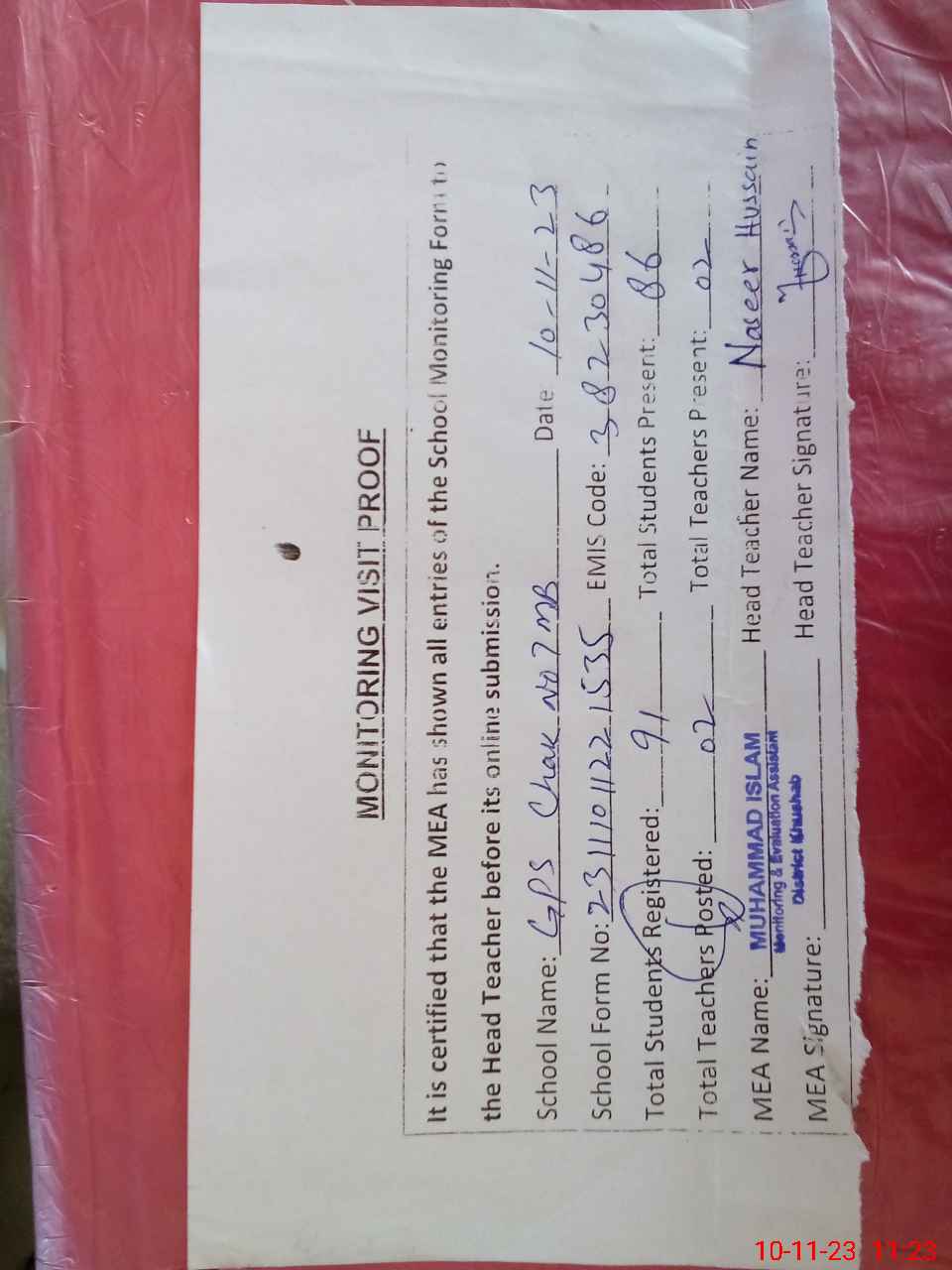 | Attendance Register | Head Teacher | MEA with School | Visit Proof |