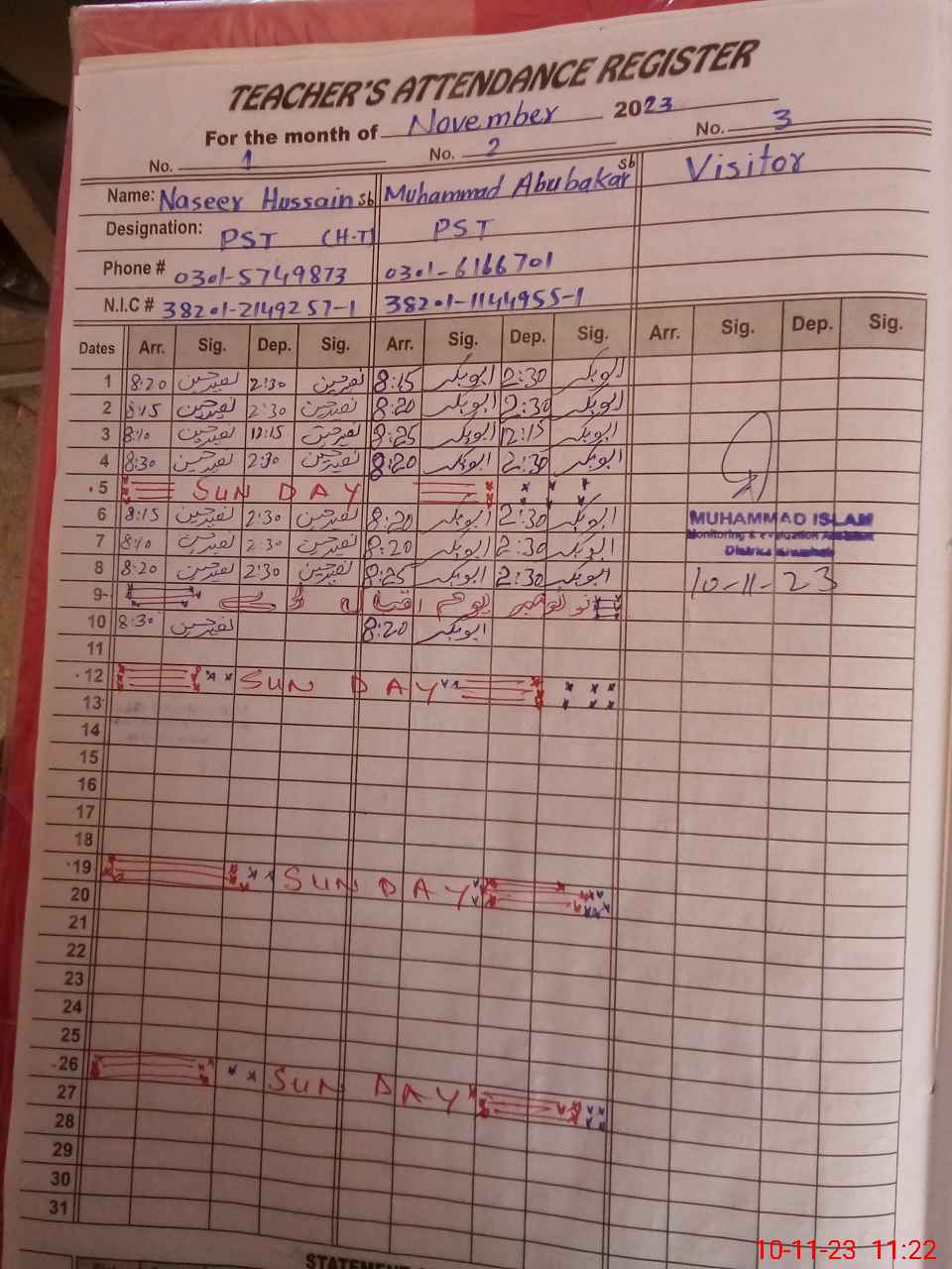 | CNIC | Full Name | Designation | R/C | Absence During Last Calender Month |