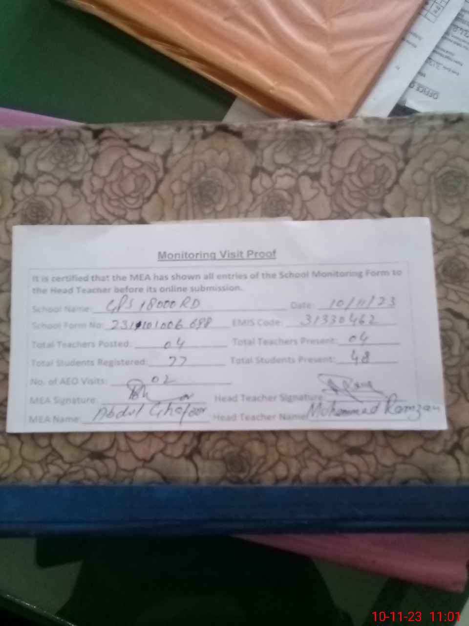 | Attendance Register | Head Teacher | MEA with School | Visit Proof |