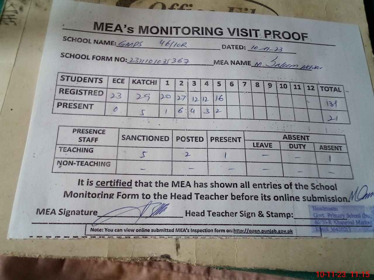 | Attendance Register | Head Teacher | MEA with School | Visit Proof |