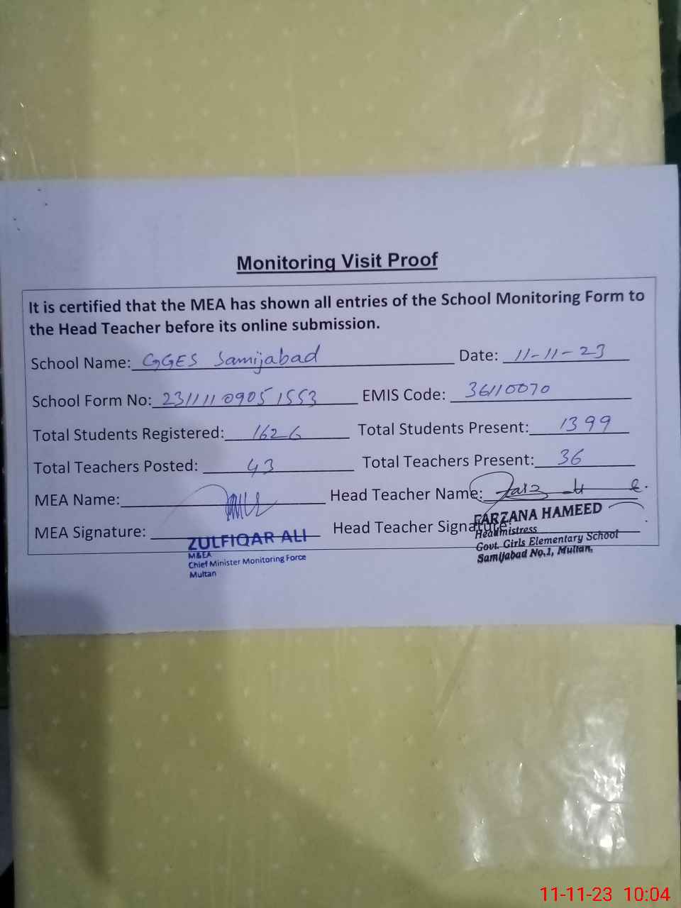 | EMIS Code: 36110070 | Name of School: GGES SAMIJABAD NO.1 MULTAN | |||