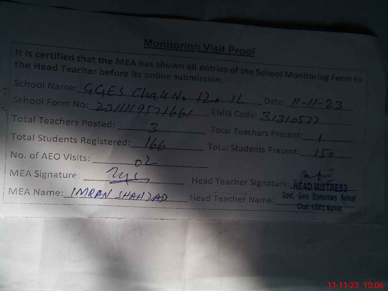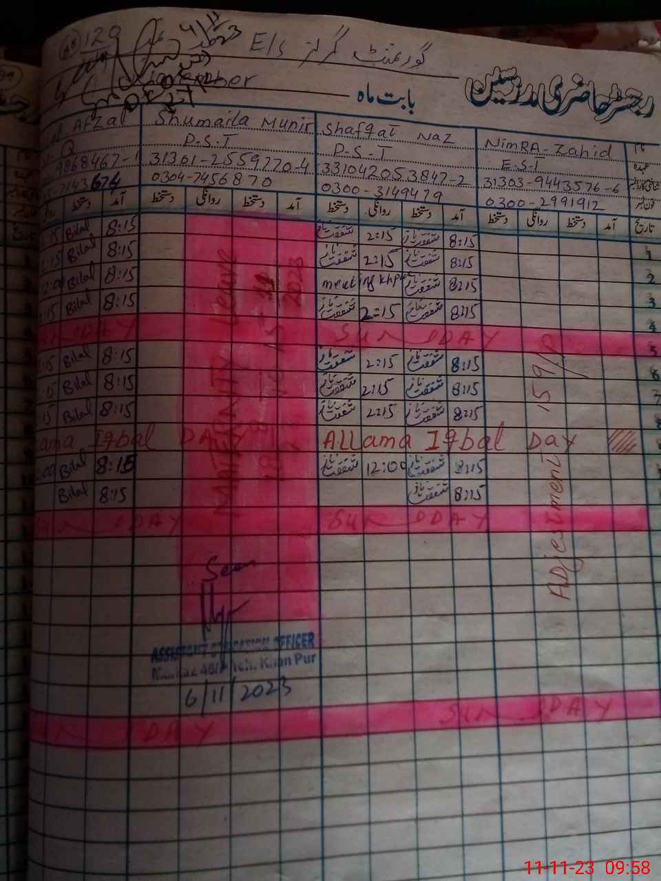 | Remarks (Use Separate Page if Required): Only one teacher is available at school for 166 students of 9 classes One teachers Nimra Zahid is attached to GPS Chak No 159P Tehsil Sadiqabad Diatt RYK since 15 August 2023 till further order One teacher is on maternity leave NSB record not maintained | |||||