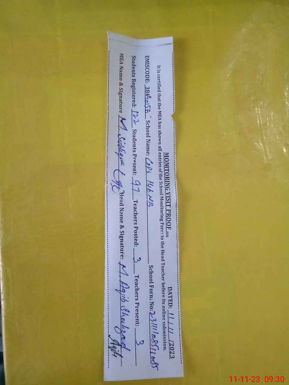 | Monitoring Date: 11-11-2023 | Start Time: 11-11-2023 08:50 AM | End Time: 11-11-2023 09:39 AM | Name of MEA: MU**** SI**** | |