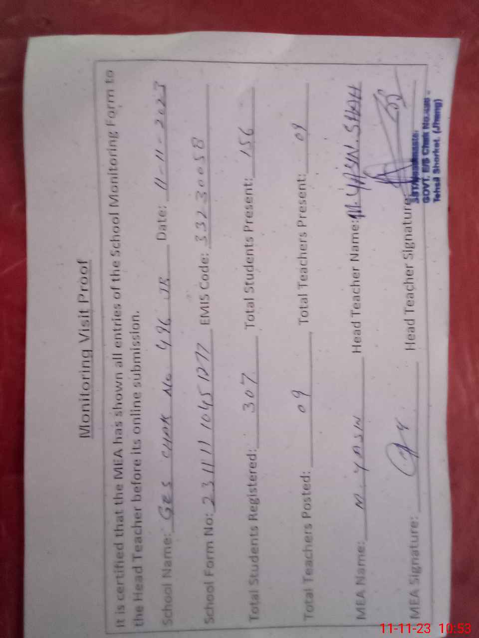 | Attendance Register | Head Teacher | MEA with School | Visit Proof |