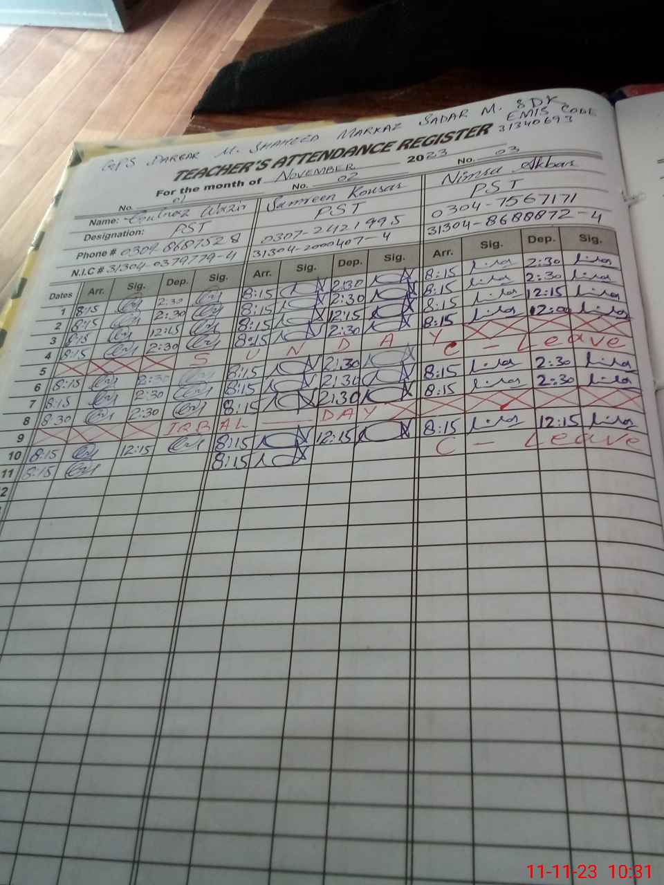 | CNIC | Full Name | Designation | R/C | Absence During Last Calender Month |
