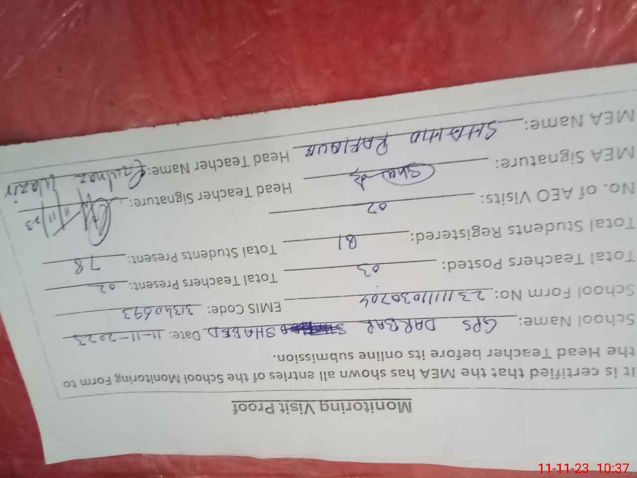 | Attendance Register | Head Teacher | MEA with School | Visit Proof |