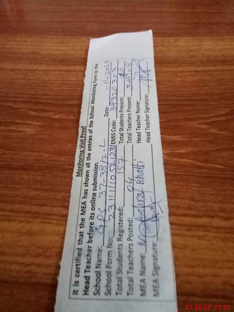 | Monitoring Date: 11-11-2023 | Start Time: 11-11-2023 10:52 AM | End Time: 11-11-2023 11:37 AM | Name of MEA: MU**** AS**** BH**** (R**** | |