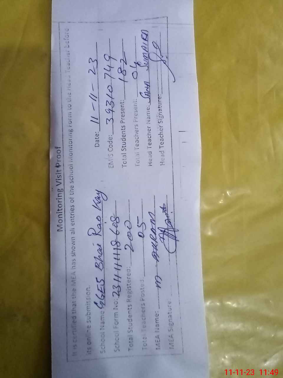 | Attendance Register | Head Teacher | MEA with School | Visit Proof |