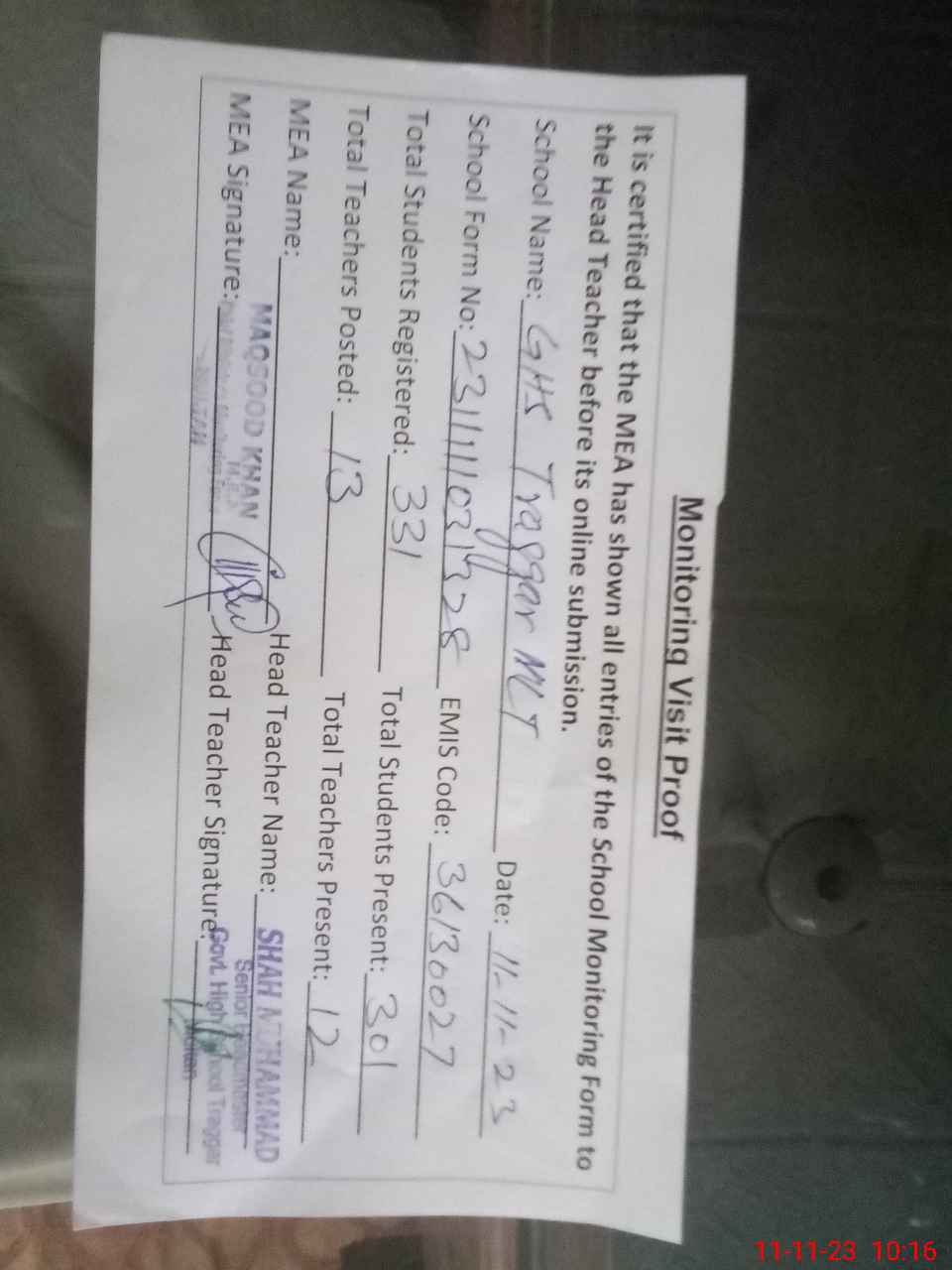| EMIS Code: 36130027 | Name of School: GHS TRAGGAR MULTAN | |||