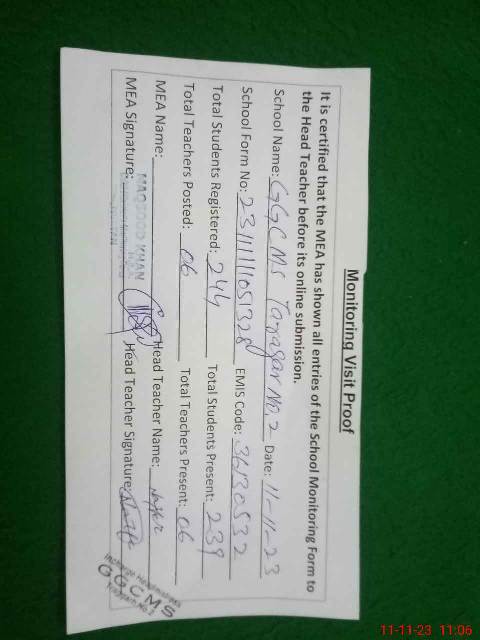 | Attendance Register | Head Teacher | MEA with School | Visit Proof |