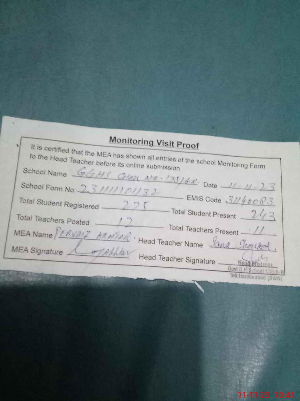 | Attendance Register | Head Teacher | MEA with School | Visit Proof |