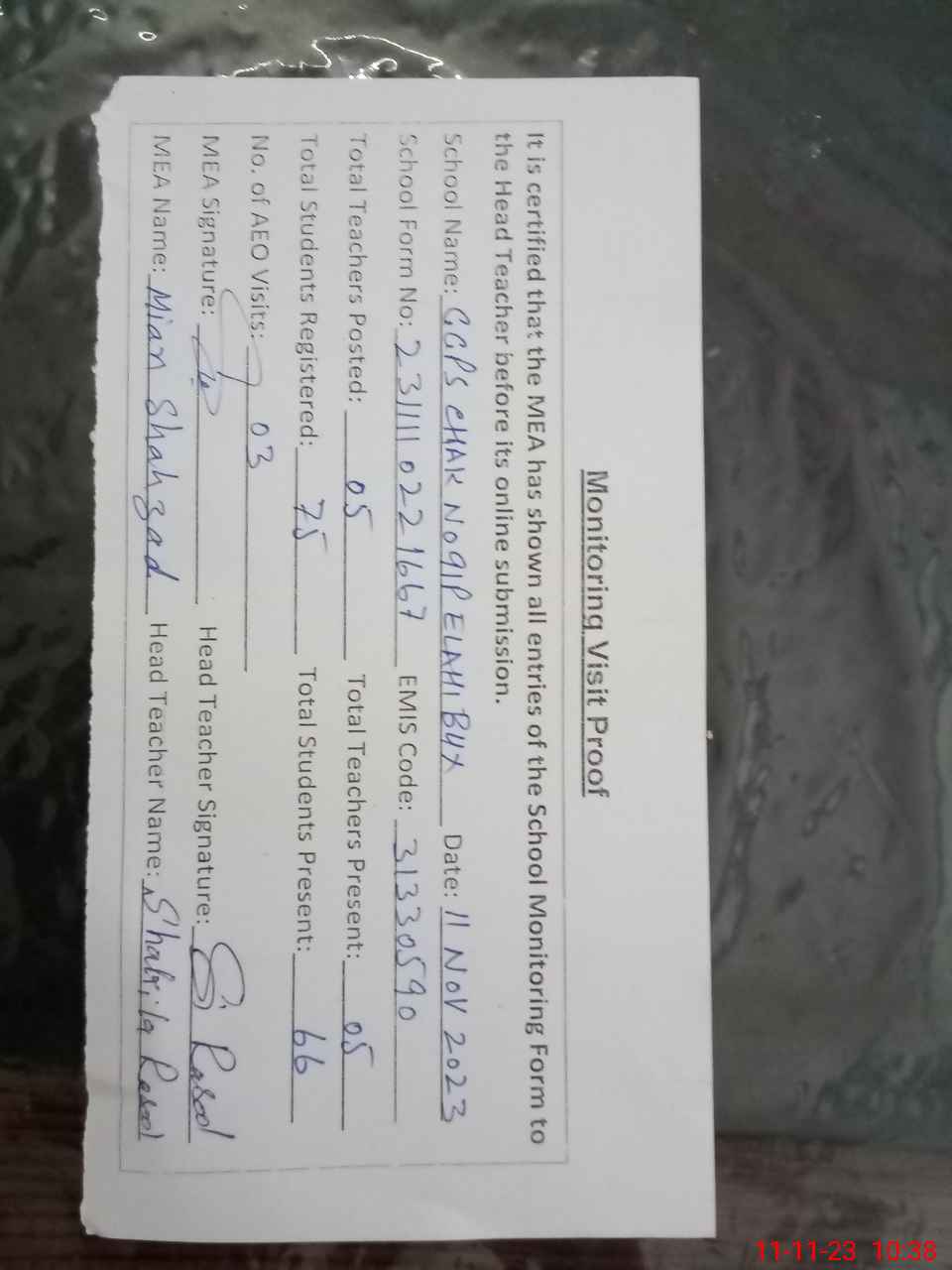 | Monitoring Date: 11-11-2023 | Start Time: 11-11-2023 09:56 AM | End Time: 11-11-2023 10:38 AM | Name of MEA: Sh**** Ah**** | |