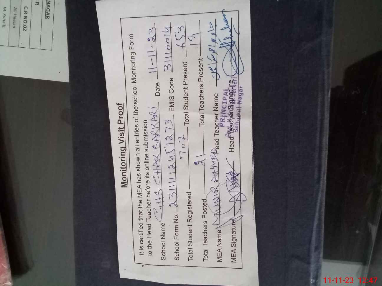| Attendance Register | Head Teacher | MEA with School | Visit Proof |