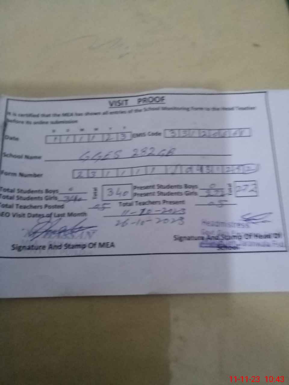 | Attendance Register | Head Teacher | MEA with School | Visit Proof |