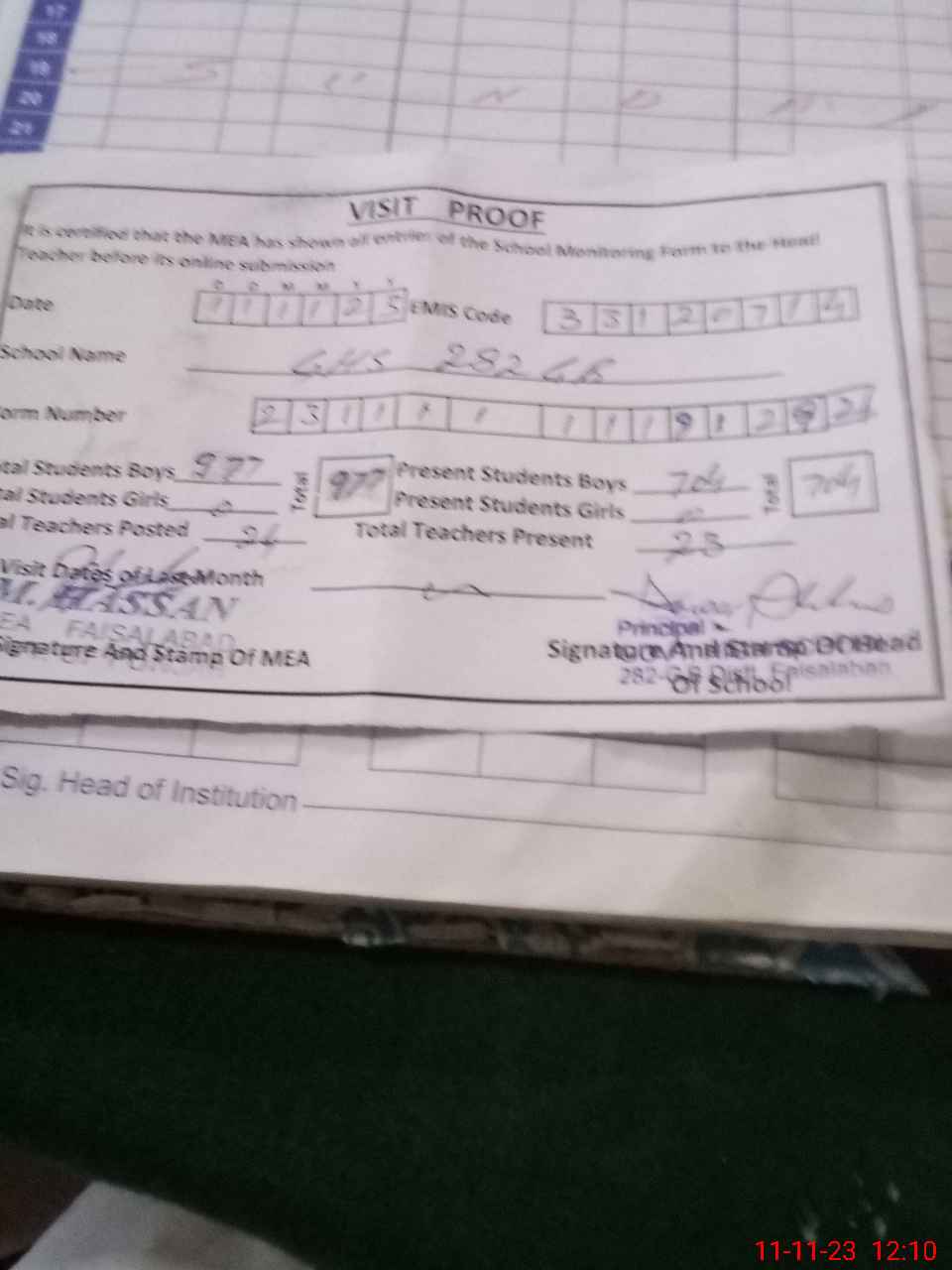 | Attendance Register | Head Teacher | MEA with School | Visit Proof |