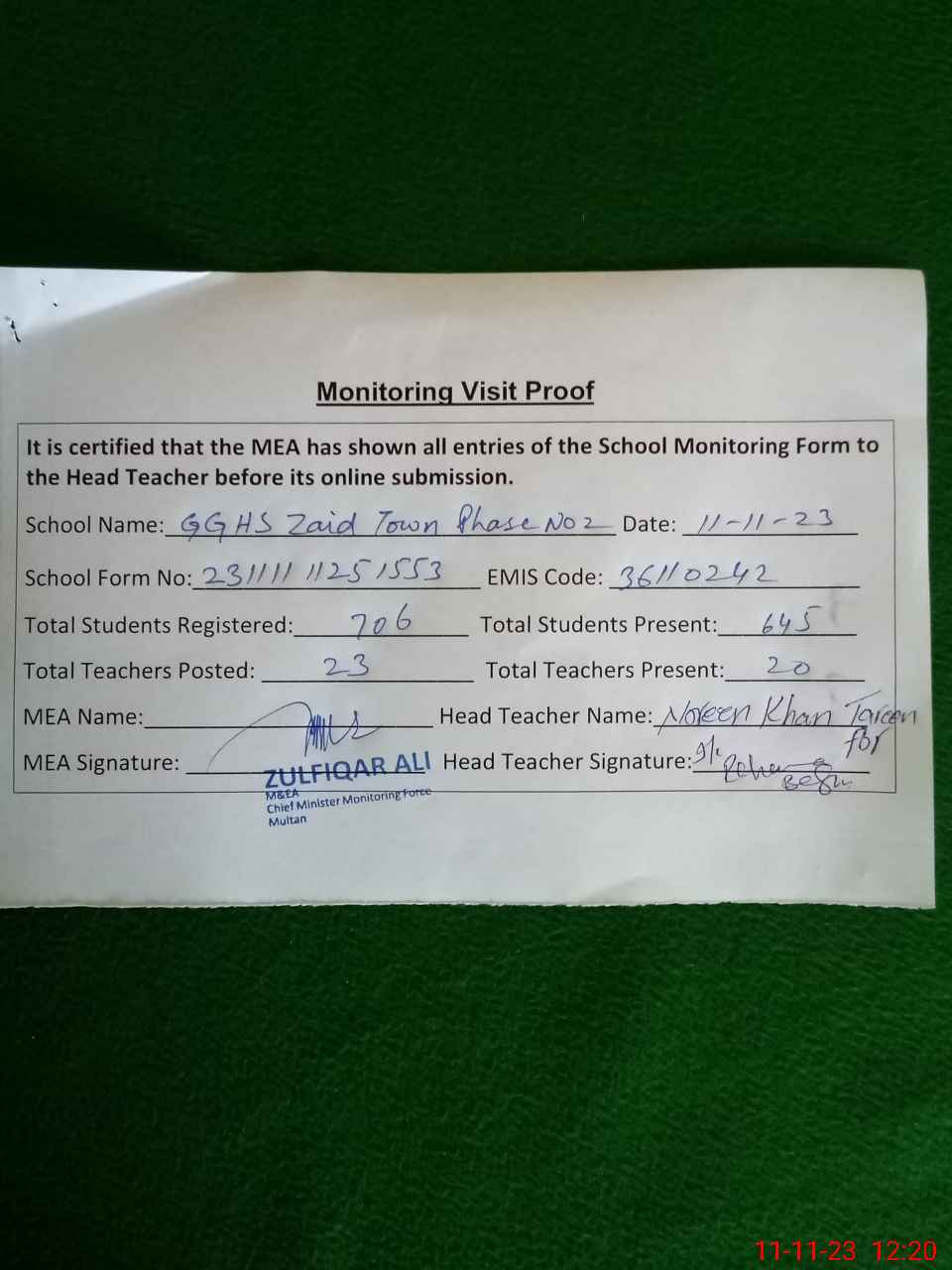 | Monitoring Date: 11-11-2023 | Start Time: 11-11-2023 11:24 AM | End Time: 11-11-2023 12:20 PM | Name of MEA: Zu**** Al**** | |