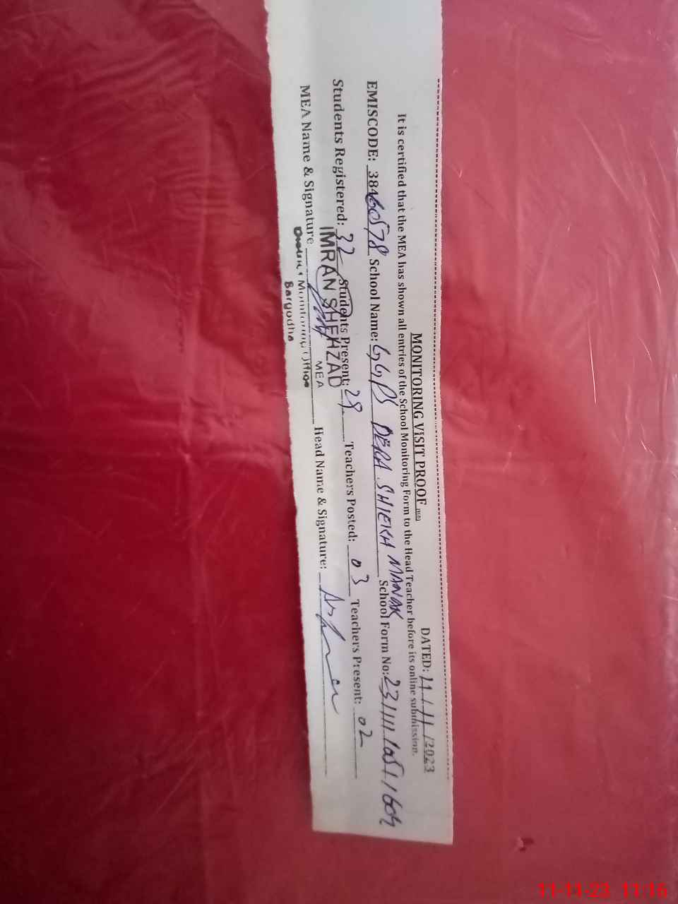 | Monitoring Date: 11-11-2023 | Start Time: 11-11-2023 10:51 AM | End Time: 11-11-2023 11:17 AM | Name of MEA: IM**** SH**** | |