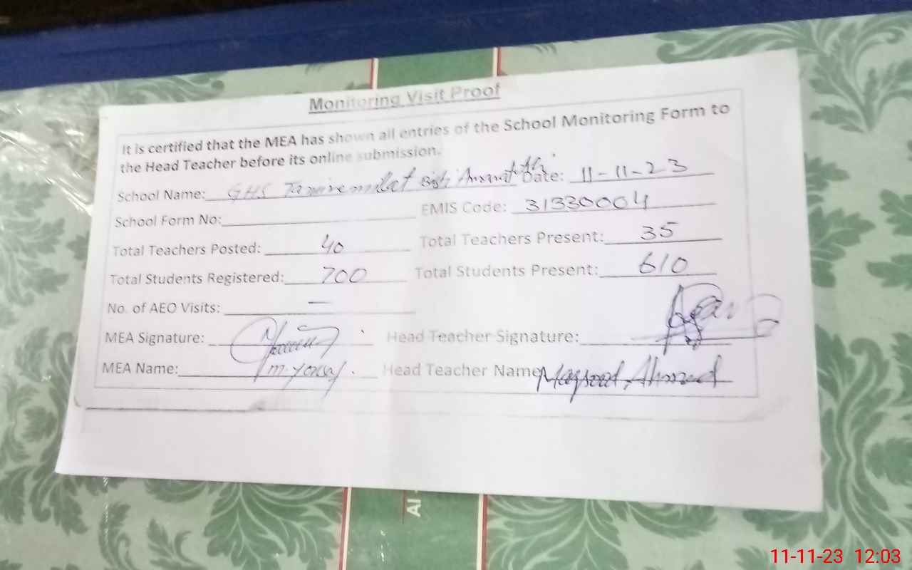 | Certified that this School was Inspected by the Undersigned MEA/DMO Today and the Information Stated Above is as Per Record. | |||||