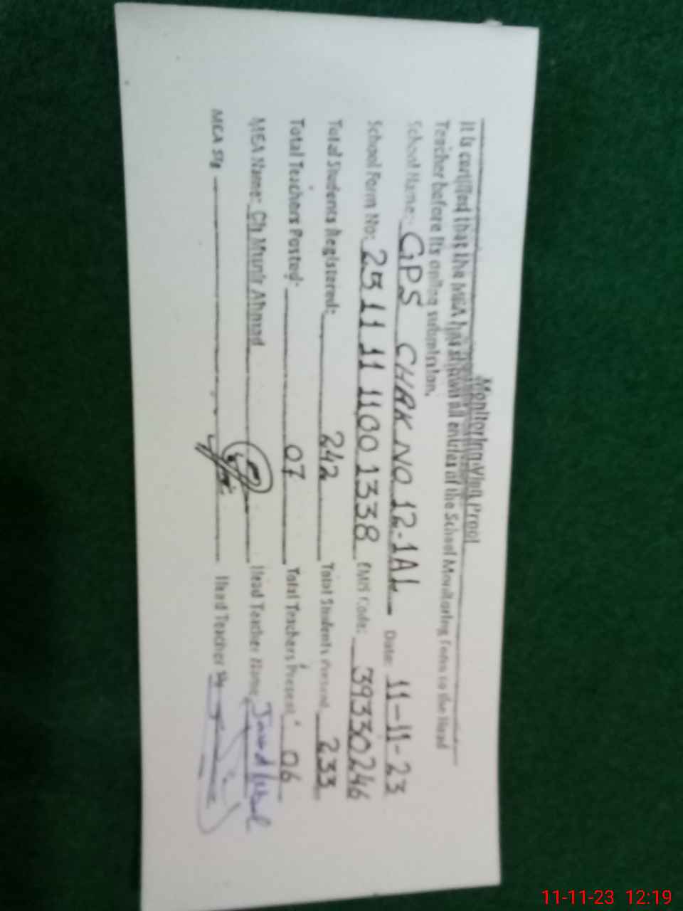| Monitoring Date: 11-11-2023 | Start Time: 11-11-2023 11:00 AM | End Time: 11-11-2023 12:19 PM | Name of MEA: MU**** AH**** | |