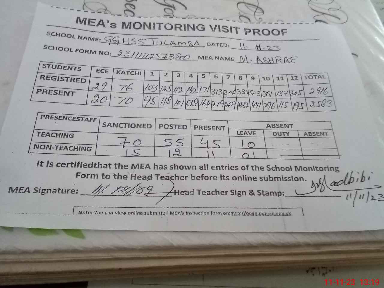 | Attendance Register | Head Teacher | MEA with School | Visit Proof |