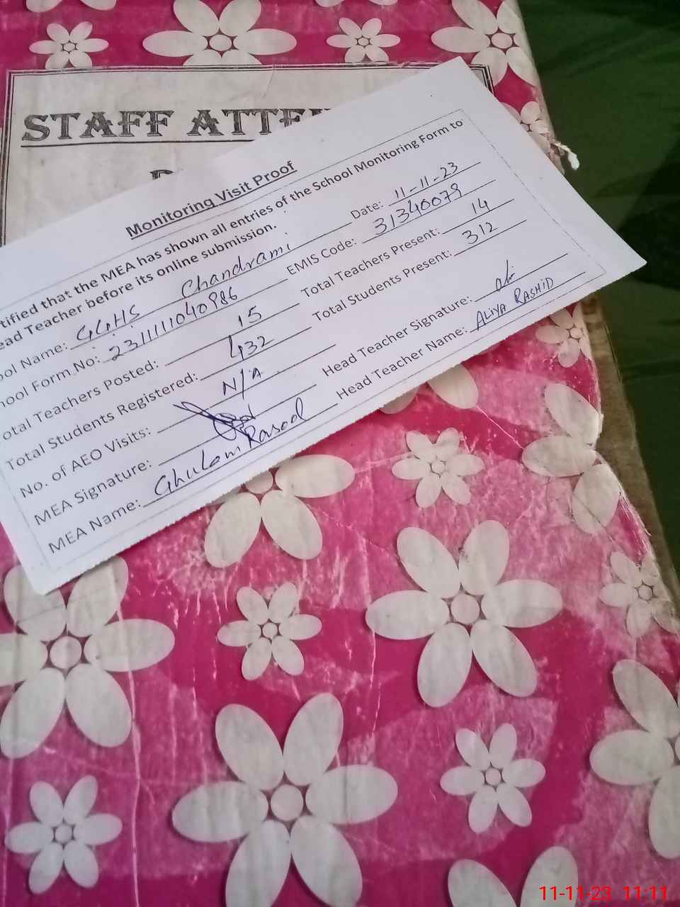 | Attendance Register | Head Teacher | MEA with School | Visit Proof |