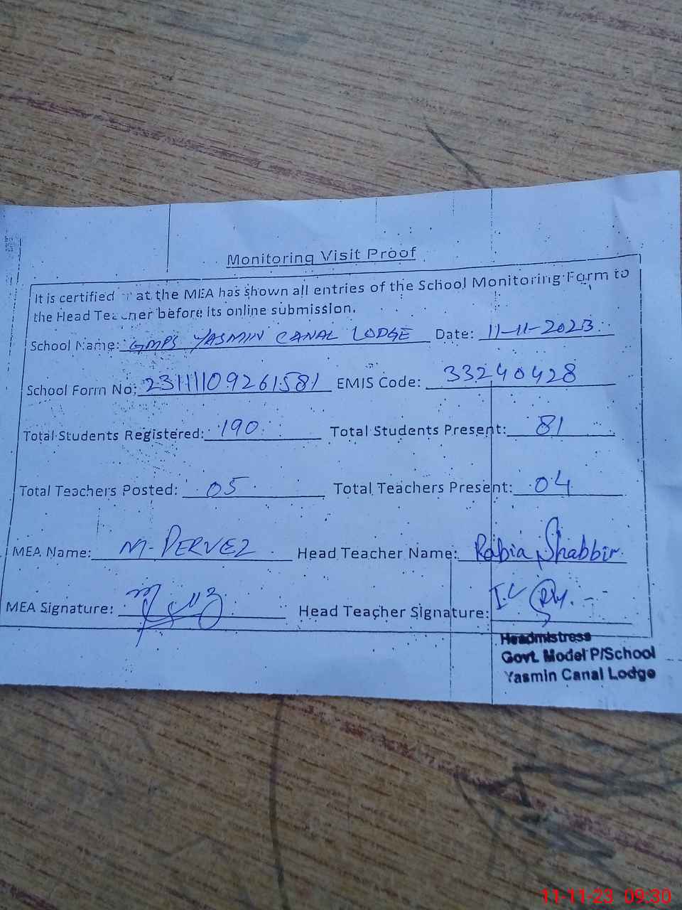 | EMIS Code: 33240428 | Name of School: GMPS YASMIN CANAL LODGE | |||