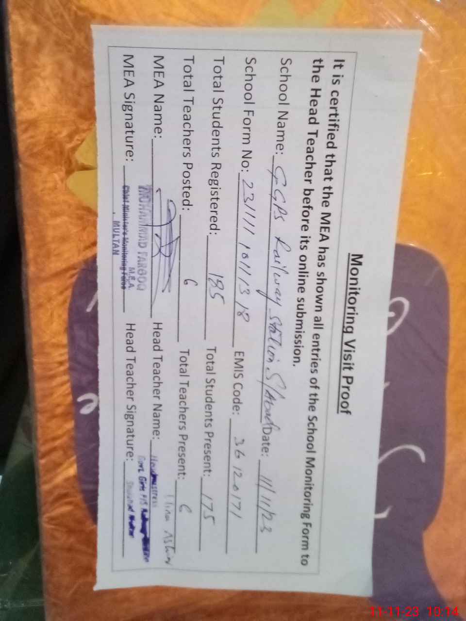 | EMIS Code: 36120171 | Name of School: GGPS RAILWAY STATION SHUJABAD | |||