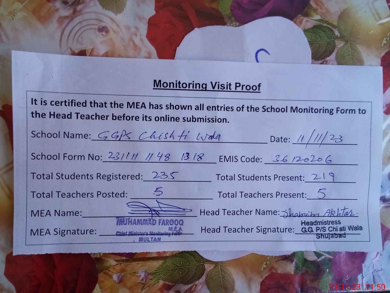| EMIS Code: 36120206 | Name of School: GGPS CHISHTI WALA SHUJABAD | |||