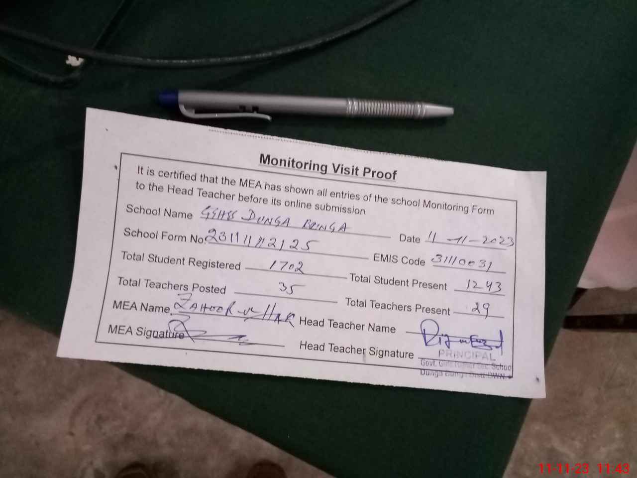 | Attendance Register | Head Teacher | MEA with School | Visit Proof |