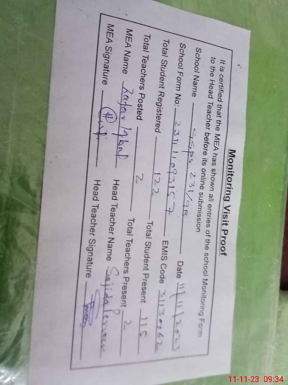 | Monitoring Date: 11-11-2023 | Start Time: 11-11-2023 09:18 AM | End Time: 11-11-2023 09:34 AM | Name of MEA: Za**** Iq**** BN**** | |