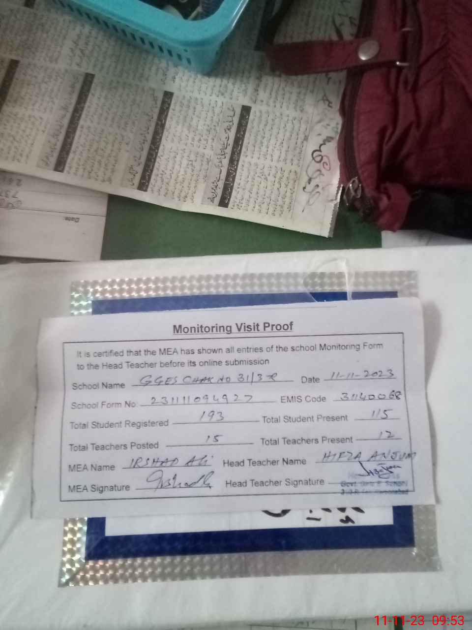 | Attendance Register | Head Teacher | MEA with School | Visit Proof |
