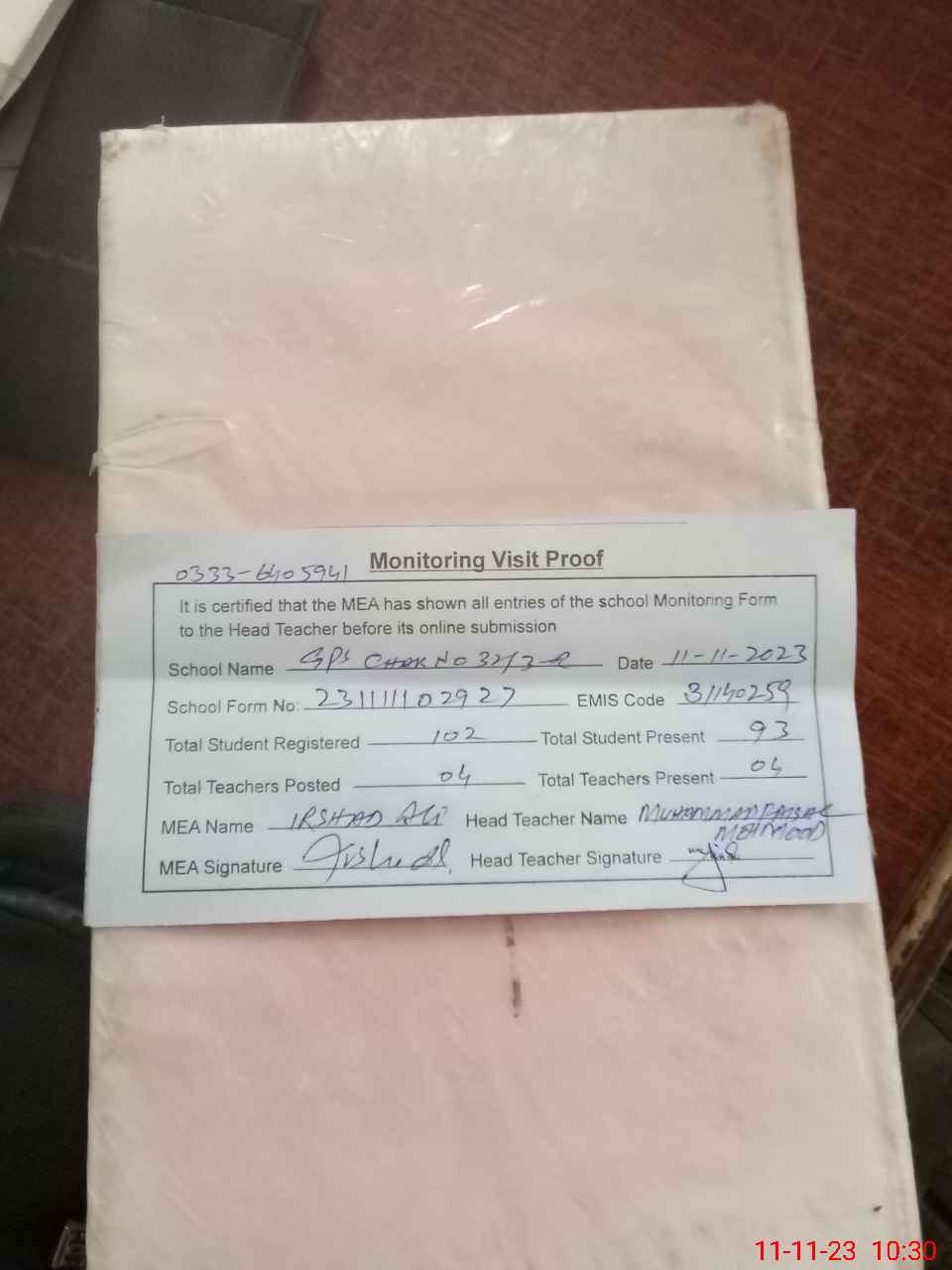 | EMIS Code: 31140259 | Name of School: GPS CHAK NO.32/3-R | |||