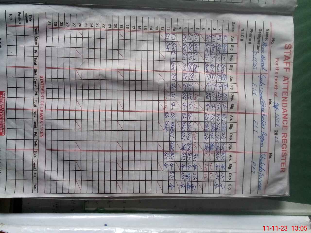 | CNIC | Full Name | Designation | R/C | Absence During Last Calender Month |