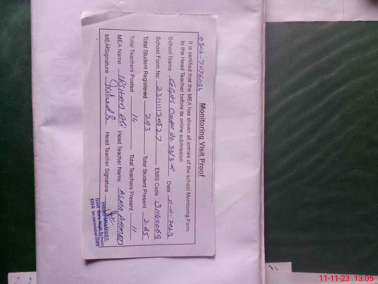 | Name: AS**** AH**** Designation: (School Headmaster's/Headmistress's) S.S.T. SCI Phone/Cell Number: 03**** |