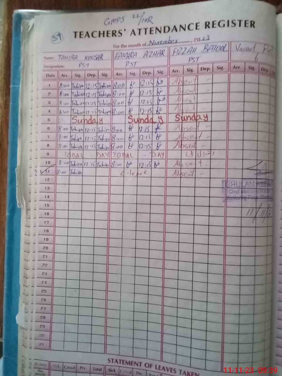 | Monitoring Date: 11-11-2023 | Start Time: 11-11-2023 09:09 AM | End Time: 11-11-2023 10:18 AM | Name of MEA: GH**** AB**** | |