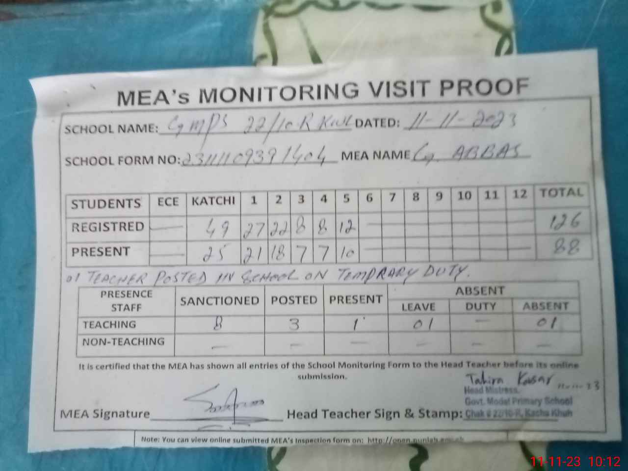 | Attendance Register | Head Teacher | MEA with School | Visit Proof |