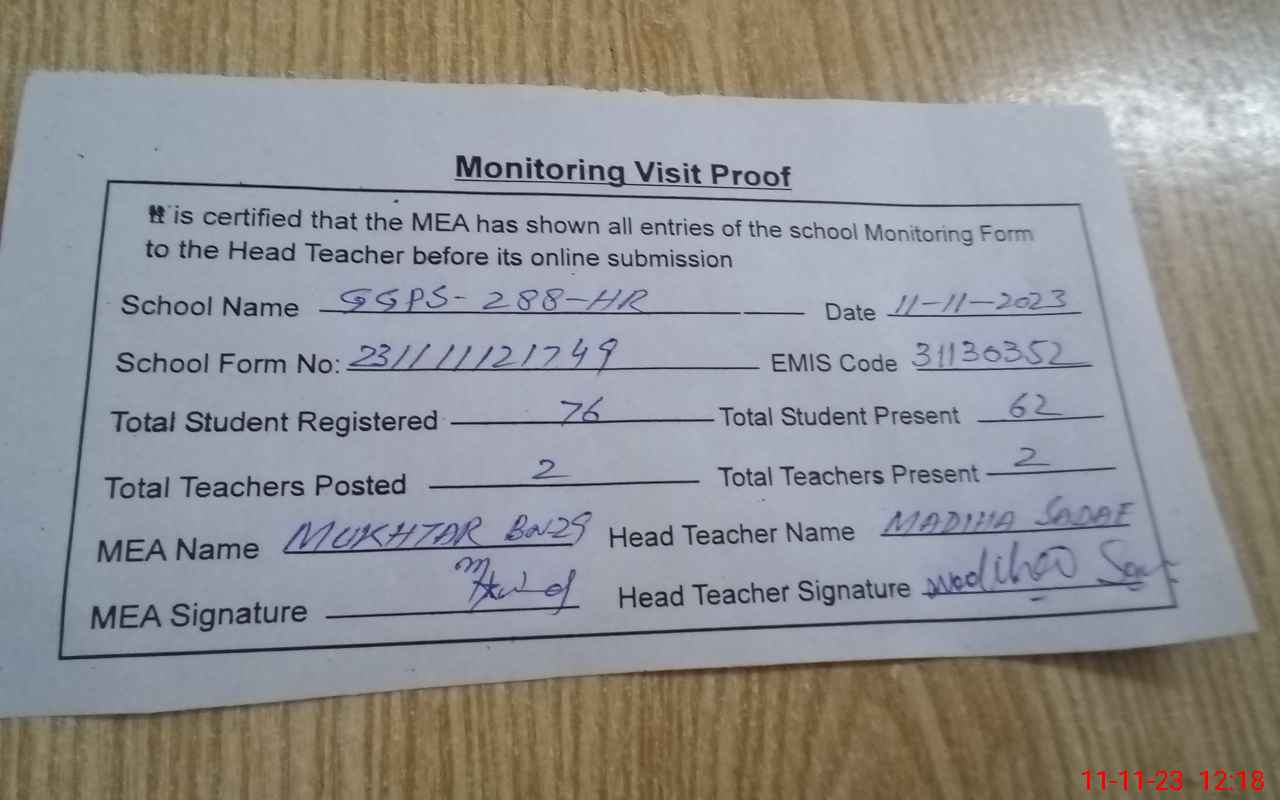 | EMIS Code: 31130352 | Name of School: GGPS CHAK NO 288 HR | |||