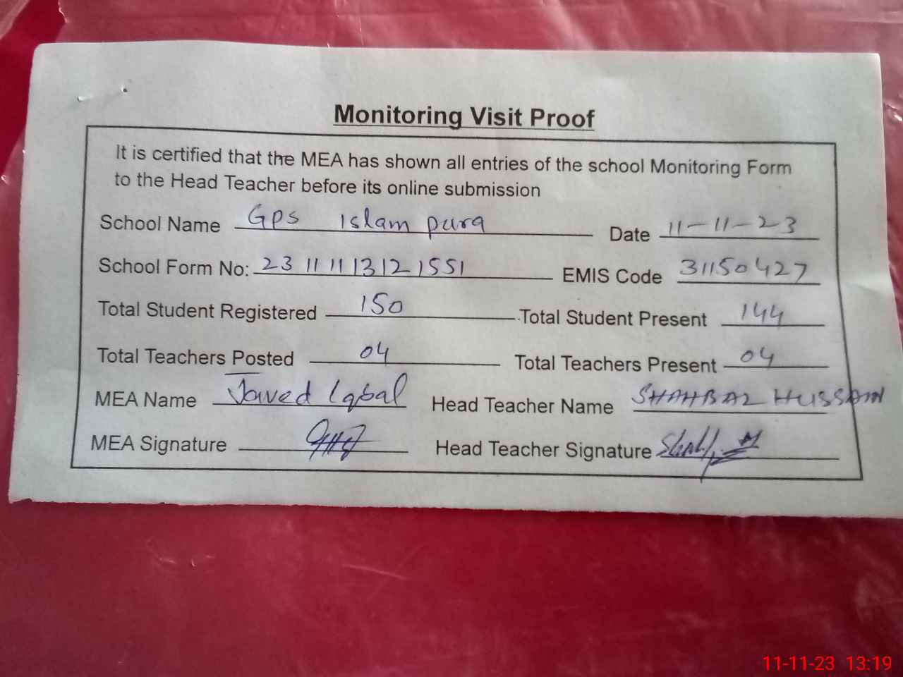 | Attendance Register | Head Teacher | MEA with School | Visit Proof |