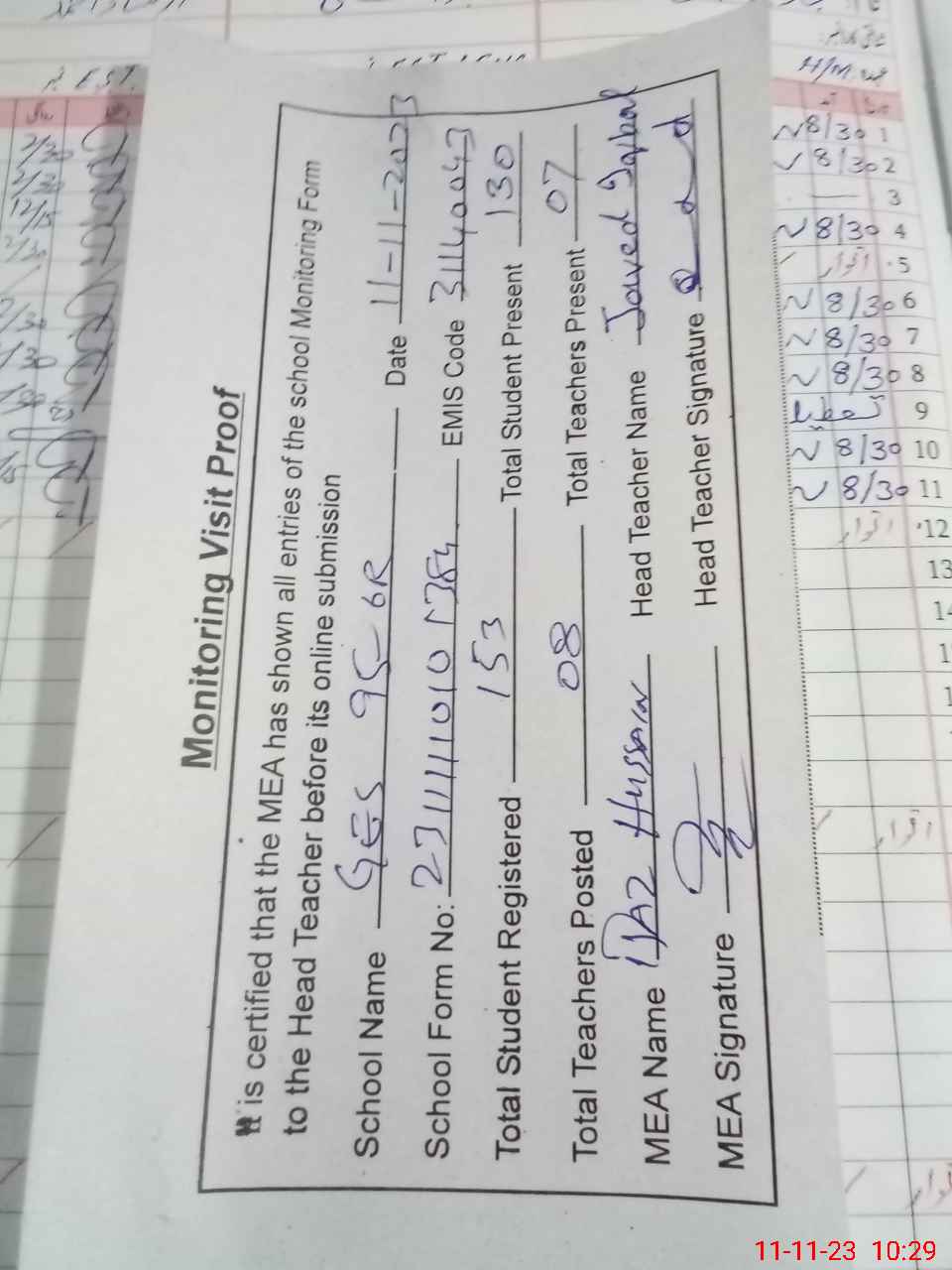 | Attendance Register | Head Teacher | MEA with School | Visit Proof |