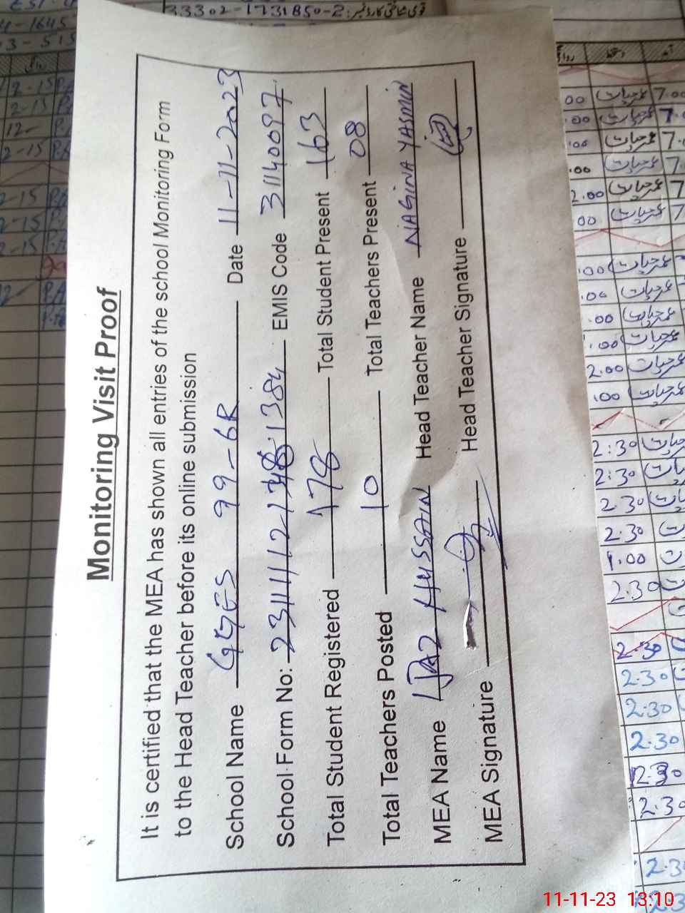 | Attendance Register | Head Teacher | MEA with School | Visit Proof |